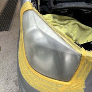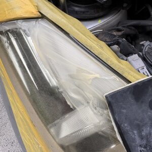 〈施工の仕方〉 最初にヘッドライト周りをテープで養生します。しっかり養生することでしっかり磨くことが出来るんです